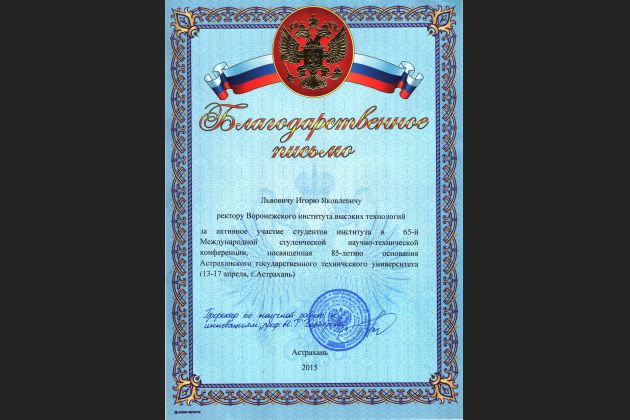 Воронежский институт высоких технологий представляли студентки 5 курса группы СКСТ-101 Пивоварова Юлия и Шушкова Оксана. Работа конференции проходила по двум направлениям – научному и инновационному. Студентки выбрали научное направление и представили доклад в секции «Гуманитарные науки» на тему: «Особенности языковой подготовки в вузе». Помимо получения памятных дипломов, девушки смогли получить и массу впечатлений от самого города Астрахань. Больше всего им запомнился Астраханский кремль, внешний вид театра оперы и балета, который был похож на красивый замок, и набережная со всевозможными интересными скульптурами, например «Дама с собачкой» и «Золотая рыбка».
