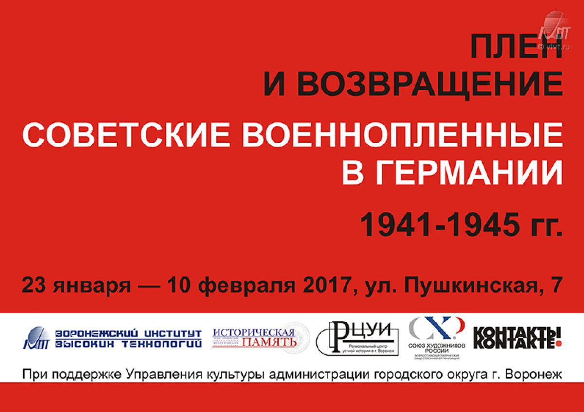 В преддверии Дня освобождения Воронежа от немецко-фашистской оккупации Воронежский институт высоких технологий и Региональный центр устной истории приглашают на открытие выставки «Советские военнопленные в Германии 1941-1945. Плен и возвращение». Мероприятие состоится 23 января в 15.00 по адресу: г. Воронеж, ул. Пушкинская, д. 7.
