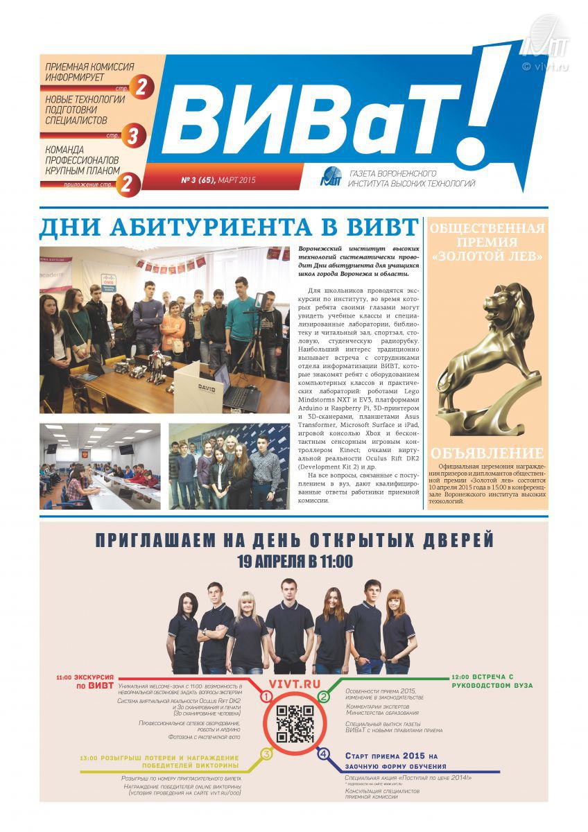 10 апреля 2015 года прошел очный этап и официальная церемония награждения победителей и призеров конкурса на соискание региональной Общественной премии "Золотой Лев-2015". На конкурс было заявлено более 200 работ учащихся и студентов муниципальных образовательных организаций и учреждений профессионального образования г. Воронежа, Воронежской области и иных регионов.04 апреля 2015 года в Воронежском институте высоких технологий прошел День абитуриента. Институт посетили выпускники школ Семилукского и Острогожского районов Воронежской области.
