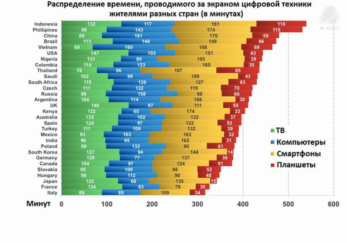 Авторитетнейший аналитик в мире современных цифровых технологий Мэри Микер (Mary Meeker) опубликовала доклад, в котором отражена диаграмма с результатами ежедневного времяпрепровождения современных пользователей перед экранами различной цифровой техники в 30 странах мира. Как оказалось, больше всех времени за экранами телевизоров и компьютеров проводят индонезийцы и филиппинцы.