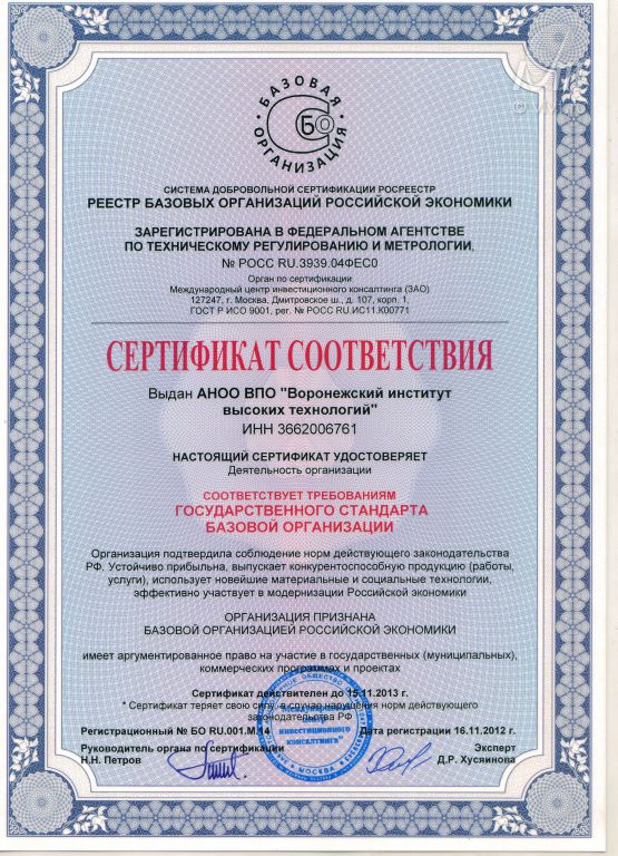 Воронежский институт высоких технологий получил сертификат соответствия, который удостоверяет, что его деятельность соответствует требованиям государственного стандарта базовой организации Российской экономики.